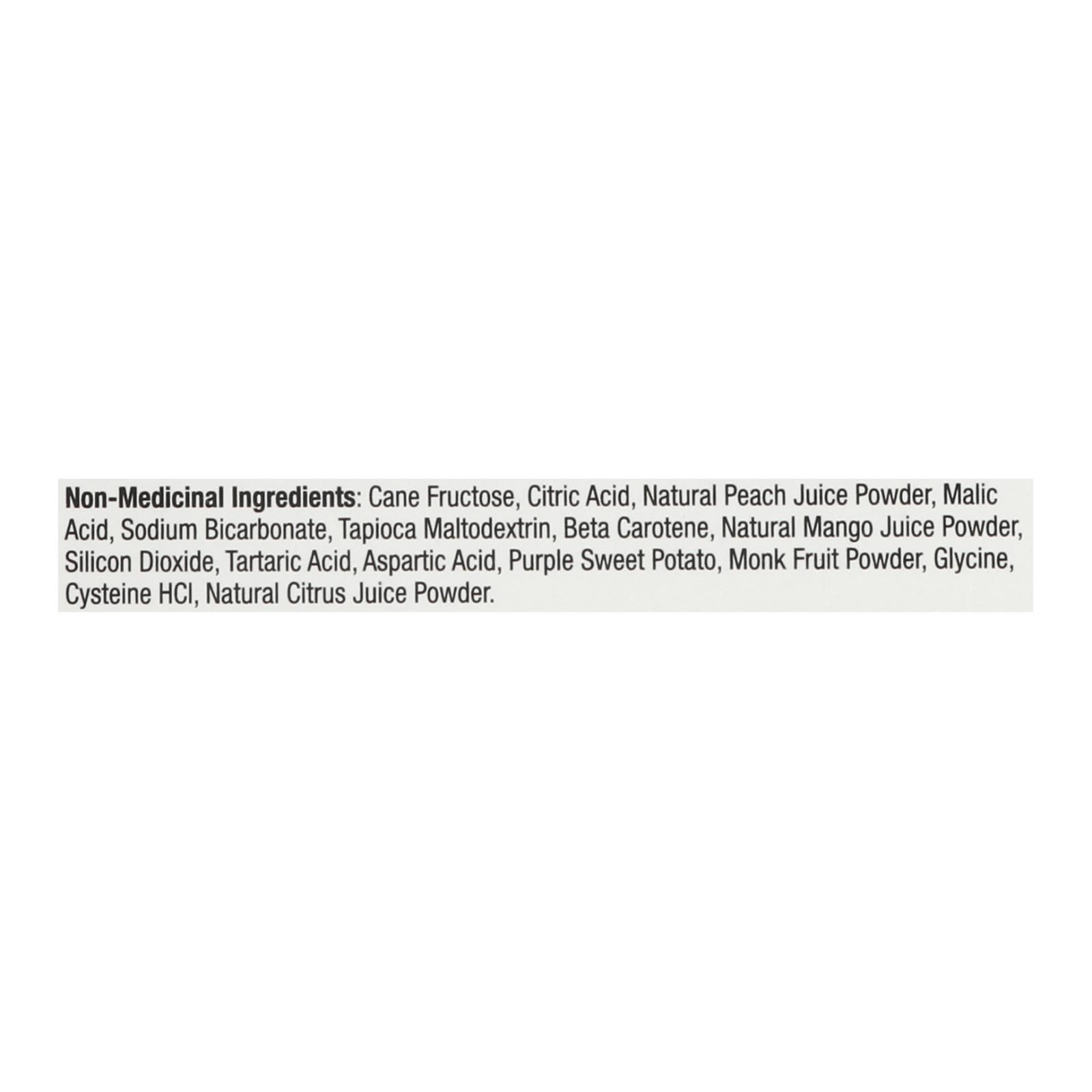 ingredients : cane fructose;citric acid;natural peach juice powder;malic acid;sodium bicarbonate;tapioca maltodextrin;beta carotene;natural mango juice powder;silicon dioxide;tartaric acid;aspartic acid;purple sweet upotato;monk fruit powder;glycine;cysteine hcl;natural citrus juice powder