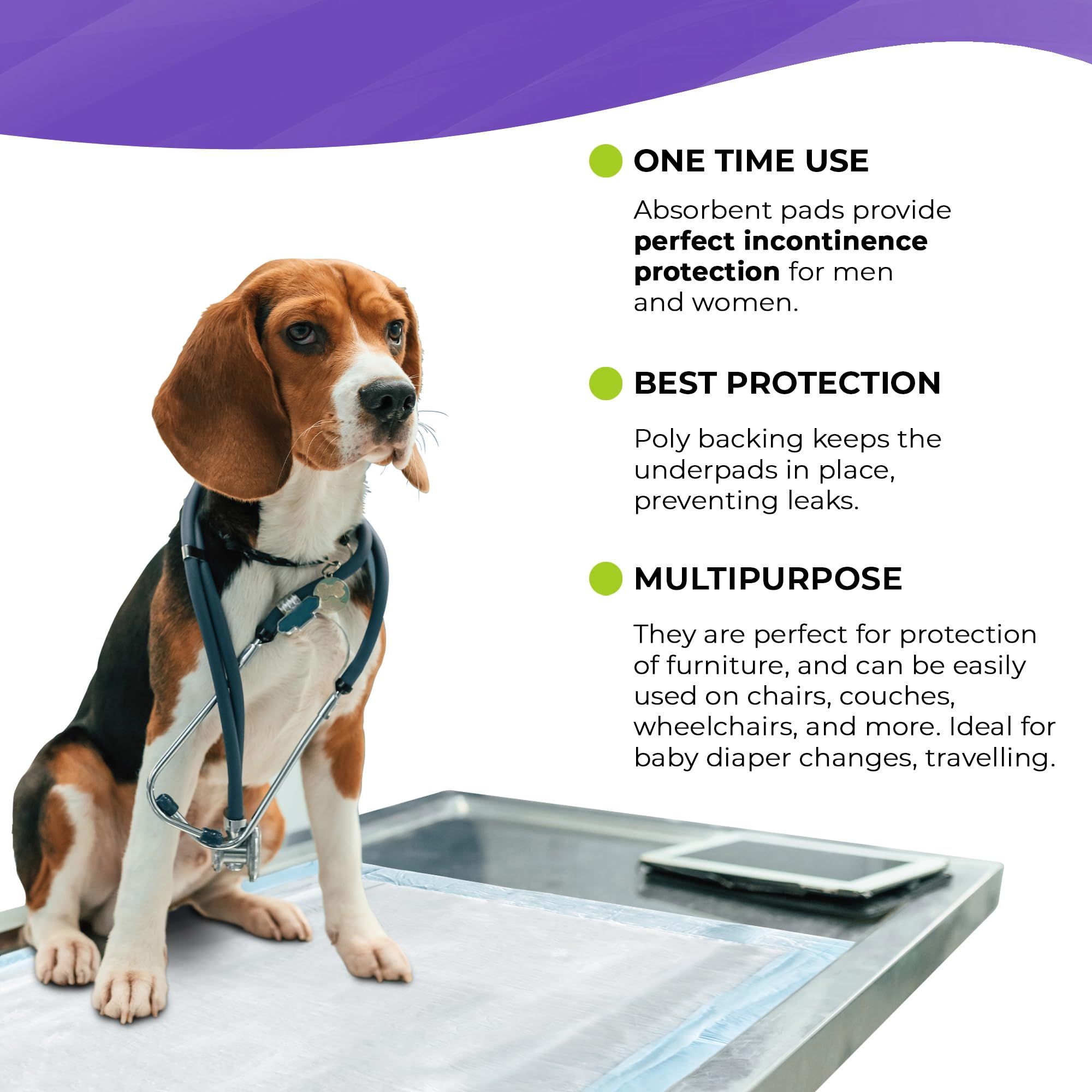 1.DISPOSABLE UNDERPADS: Absorbent pads provide perfect incontinence protection for men and women. Packaged in a bag for convenience. Quantity per bag: 300 underpads. Size of each pad: 17' x 24'. Light Absorbency.