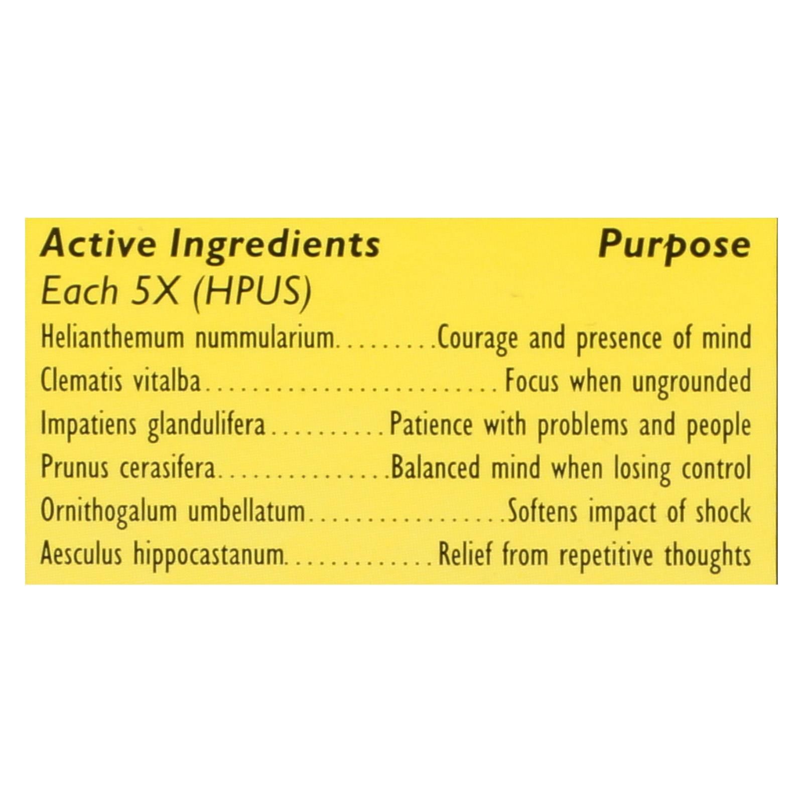 ingredients : active each 5x;hpus;helianthemum nummularium purpose courage and presence of mind clematis vitalba purpose focus when ungrounded impatiens glandulifera purpose patience with problems and people prunus cerasifera purpose balanced mind when losing control ornithogalum umbellatum purpose softens impact of shock aesculus hippocastanum purpose relieve from repetitive thoughts;inactive carnauba wax;coconut oil;gelatin;fish;grapeseed oil;natural orange flavor;natural vanilla flavor;pectin;sorbitol