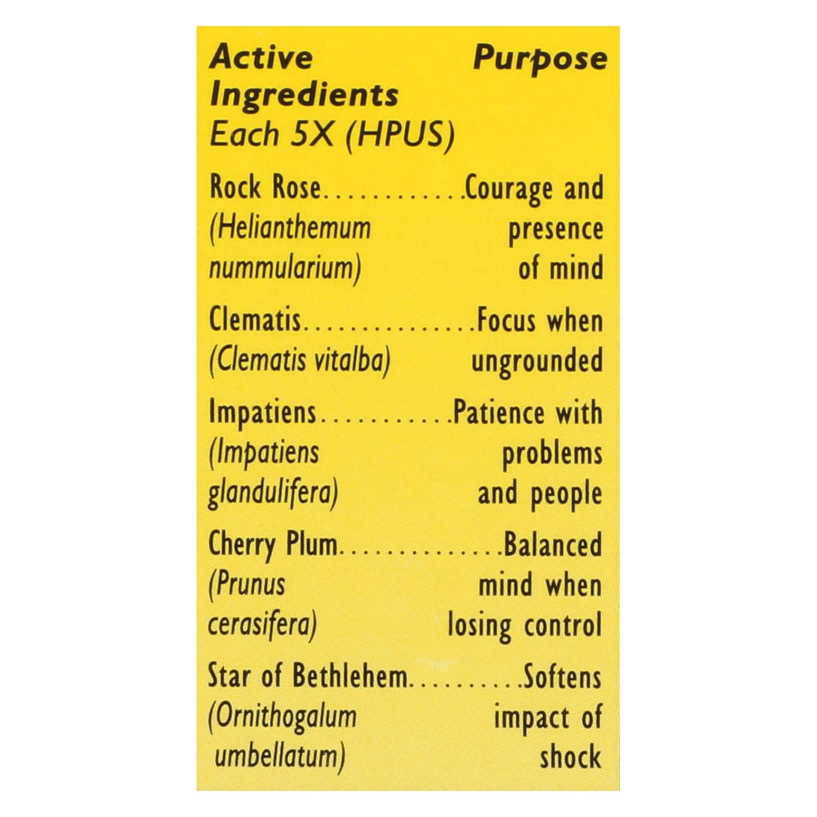 ingredients : active 5x dilution;hpus;rock rose;helianthemum nummularium;purpose courage and presence of mind clematis;clematis vitalba;purpose focus when ungrounded impatiens;impatiens glandulifera;purpose patience with problems and people cherry plum;prunus cerasifera;purpose balanced mind when losing control star of bethlehem;ornithogalum umbellatum;purpose softens impact of shock;inactive ingredient alcohol