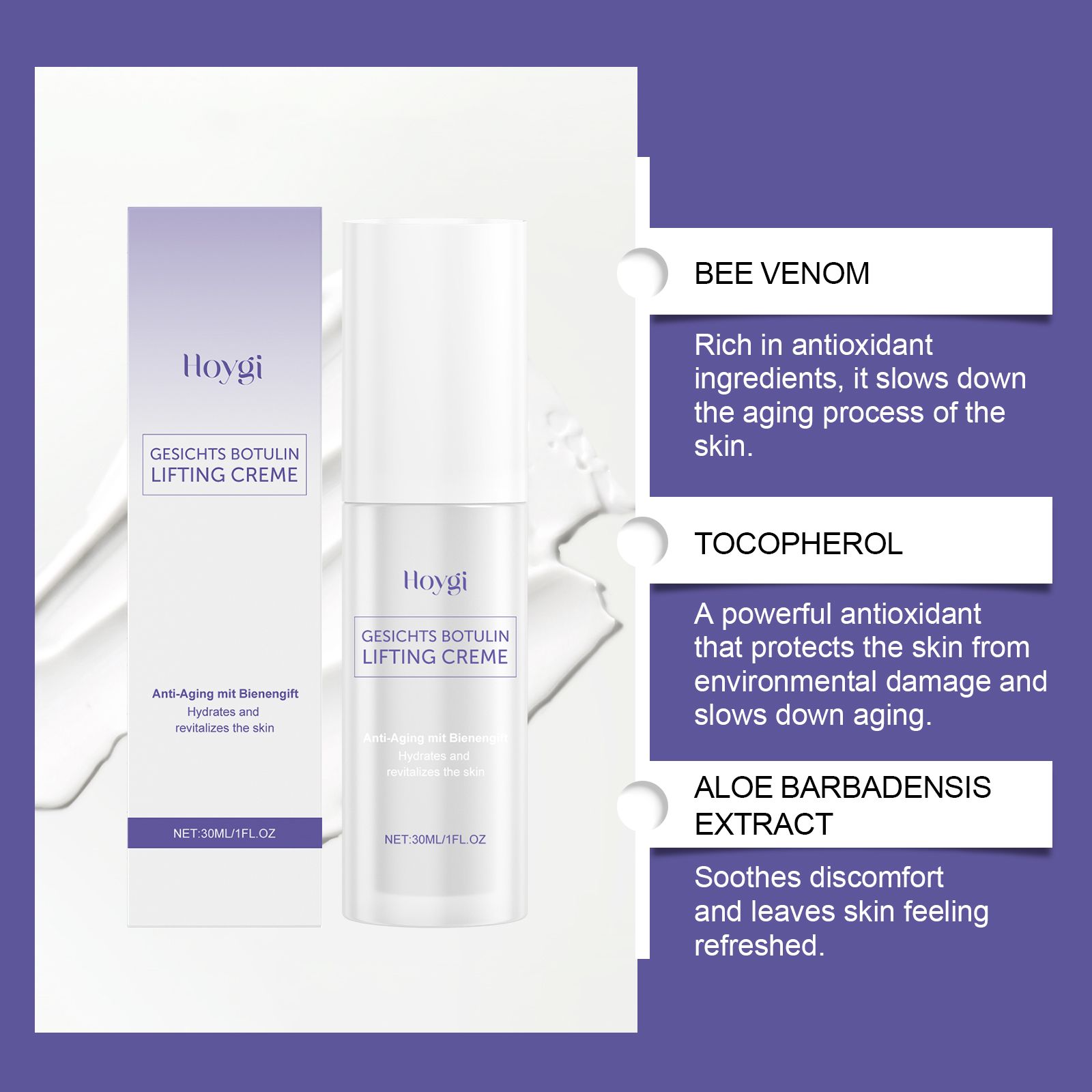 Our moisturizer contains triethanolamine, collagen and bee venom. It can provide antioxidant effects by tocopherol (vitamin E), fighting free radical damage and delaying aging. Highly effective formula helps soothe skin and relieve dryness. Its application is simple: with clean fingers, apply the appropriate amount to the head, cheeks, nose and chin. Massage gently with your fingertips for a few minutes to promote absorption. Please clean your face before use to ensure clean skin. And can be rich in nutrients, deep into the skin, providing powerful nutrients to help repair skin problems caused by aging.